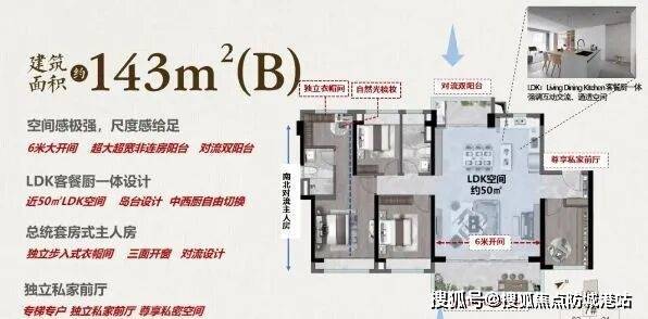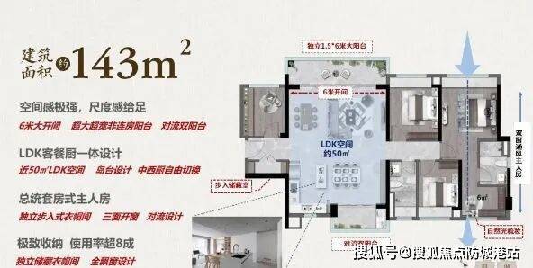 具有超高使用率,LDK空间接近50㎡。玄关首创步入式储藏室;6米大开间非连房阳台搭配双对流生活阳台,带来超尺度空间体验。主人房自带独立衣帽间且有三窗,尽显奢华。