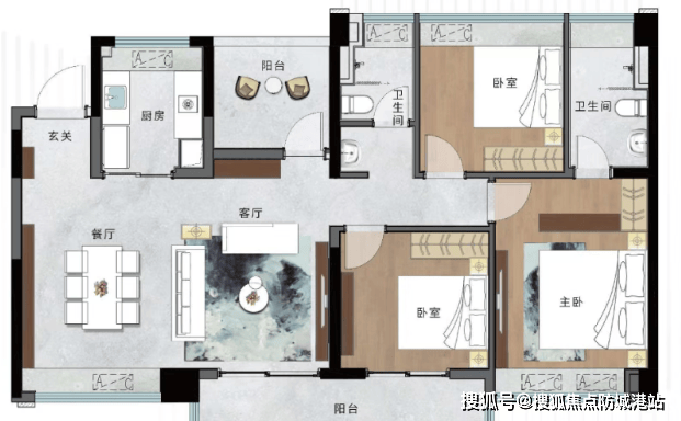 115㎡四房两厅两卫:宽敞的餐客通厅,超大观景阳台,南北采光通透,尽显尊贵。