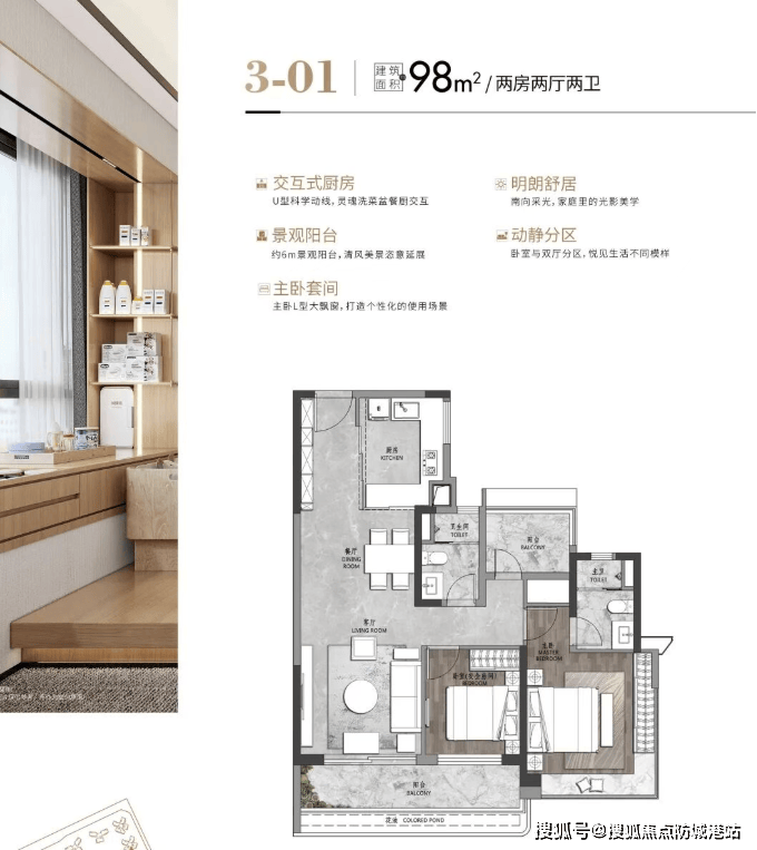 建面约98㎡ 三房两厅两卫:该户型是功能型三房的典范。约6.8米南向大阳台连接客厅与次卧,实现超尺度采光与视野。三开间朝南,保证主要功能空间全天候日照。U型厨房设计符合人体工程学,操作动线流畅。独立玄关、公私分区明确,是首改家庭或追求高品质小三房客户的绝佳选择。