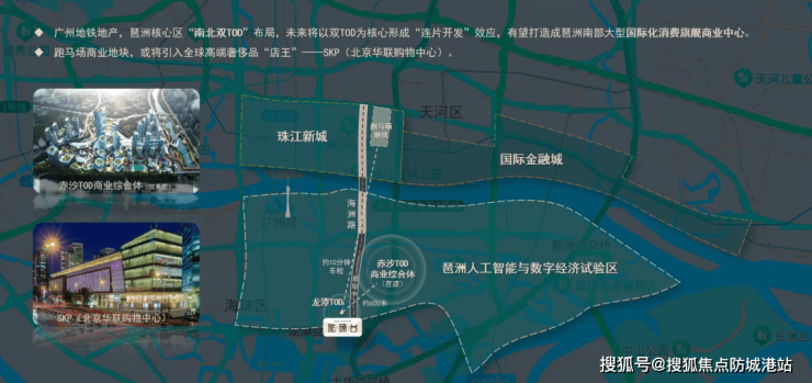 广州地铁珑璟台依托广州地铁集团“南北双TOD”规划,未来将与南侧的赤沙TOD连片开发成“国际化旗舰商业中心”,涵盖购物中心、写字楼、公寓等多种业态,预计2027年成型。目前,项目1公里内有赤沙TOD(在建),2公里范围内覆盖琶洲西区核心商圈,包含乐峰广场、南丰汇、保利广场等多个大型购物中心,涵盖餐饮、购物、娱乐、休闲等全业态服务。