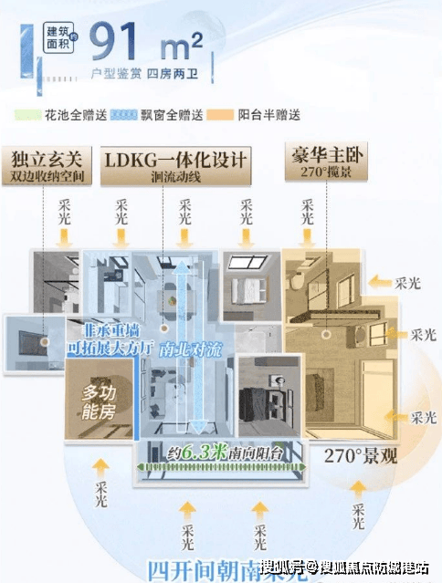 91㎡四房两厅两卫:实测套内面积109.2㎡,使用率120%;约6.3米南向景观阳台直通次卧,实测阳台进深1.8米,可打造为空中花园;主卧套房配置步入式衣帽间,实测衣帽间面积5.8㎡,满足高端收纳需求;全屋采用风光定位系统,科学规划空间布局,实测每一户采光时长均在6小时以上,实现"推窗见天光,卷帘无对视"的景观视野。该户型空间尺度媲美120㎡以上大户型,适合多代同居家庭。