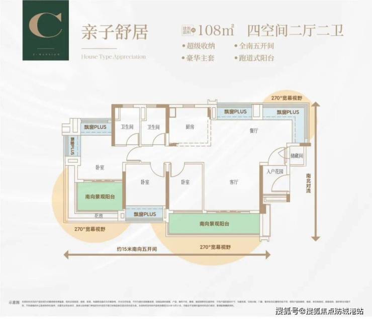 建面约108㎡户型,配置收纳玄关、储物间,打造超级收纳系统。全屋五开间朝南,南向面宽约15米,南北通透,奢享风与光。大方厅打造罕见的270°三面全景飘窗,成倍拓宽室内空间的视野。