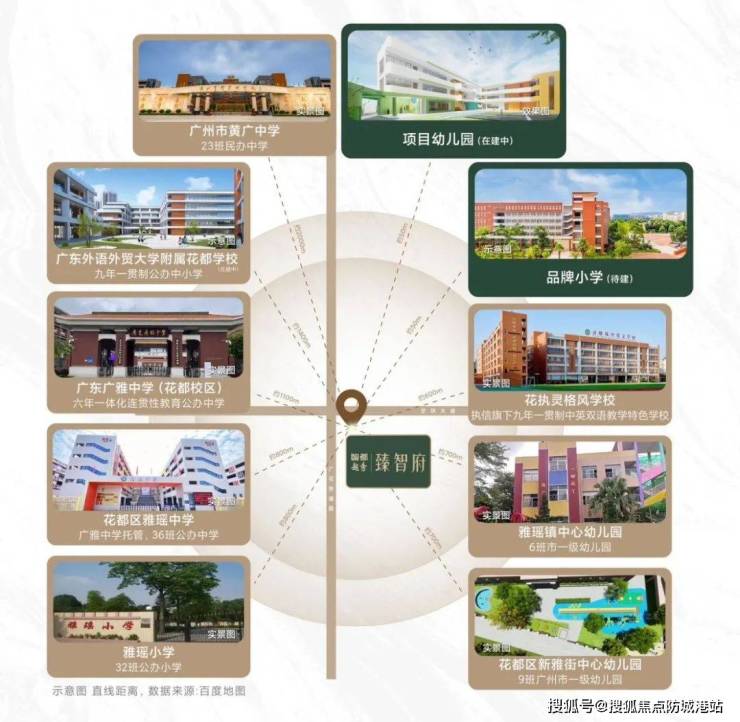 社区配建幼儿园,项目南面紧临品质小学教育用地,周边直线距离约1.5公里内涵盖小学、初中、高中等全龄段教育资源,雅瑶小学、广雅中学、黄广中学等好学校环伺,家门口铺就成才路。(数据来源:百度地图)