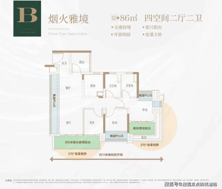 整体使用率超110%,相当于上一代约110㎡户型的使用空间。同时,南向阳台做到约5米开间,主卧配置270°环幕观景面。