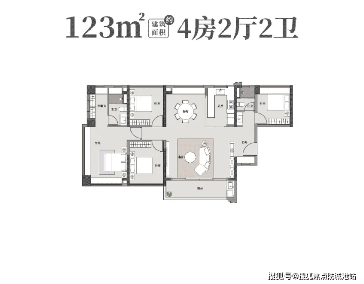 123㎡四房两卫:LDKB一体化布局(客厅+餐厅+厨房+阳台),南北对流,四开间朝南,空间通透高效。