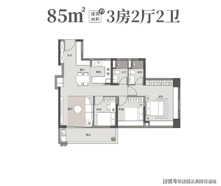 85㎡三房两卫:罕见做到四开间朝南+主卧套房+多处赠送空间,使用率突破常规,堪称刚需上车神户型;