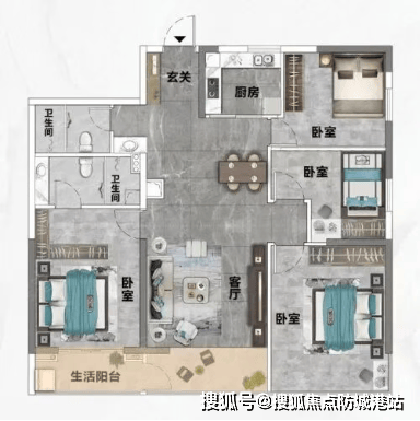 建面约123㎡4室2厅2卫:刚改主力户型,南北通透,LDK一体化大方厅设计,7米南向观景阳台,双卫干湿分离,无过道空间浪费。客厅、餐厅、厨房一体化,空间开阔,方便家庭互动;主卧带独立卫生间,保障私密性;次卧、儿童房空间充足,满足二胎家庭、三代同堂居住需求,适配一步到位改善客群。