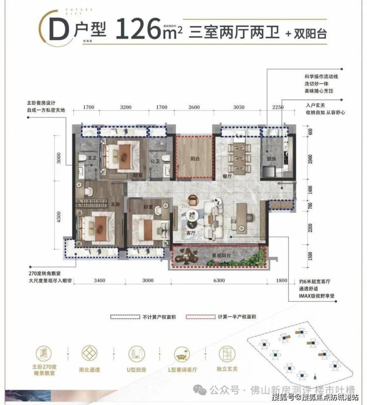 建面约 126㎡ D 户型 三房两厅两卫 + 创意阳台(可拓展四房)