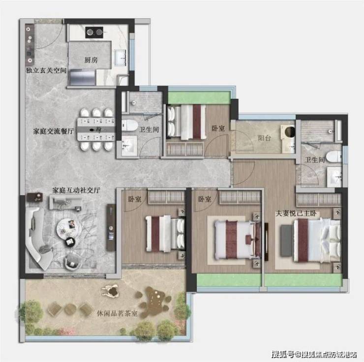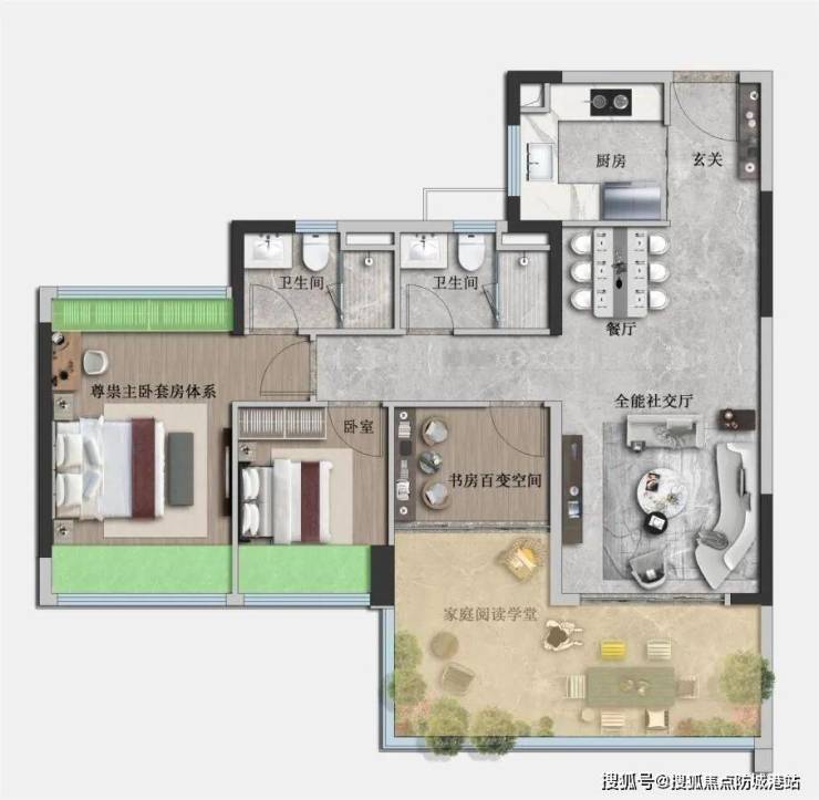 这一设计在同面积段产品中较为少见。通常98㎡三房会牺牲餐厅或压缩厨房,而该项目通过取消过道、整合功能区,使公共区域进深达7.2米,视觉通透性明显增强。主卧带L型飘窗(全赠送),次卧与书房均满足基本家具摆放尺度。值得注意的是,其宣称“100%使用率”源于阳台半赠送、飘窗全赠送及设备平台改造空间——这在广州近年新规下已属极限操作,实际得房率约82%-85%,高于市场平均水平。120㎡与140㎡四房则进一步优化动线,主卧套房配置独立衣帽区,适合改善型家庭。