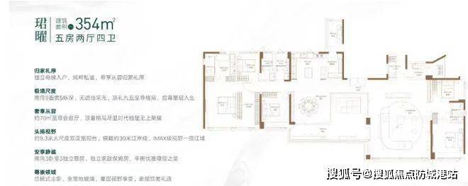 约 354㎡的 5 房 2 厅 4 卫户型堪称奢居典范。五开间朝南且采光无遮挡,让阳光毫无保留地洒入室内,营造出明亮、温暖的居住氛围。客厅面积约 70㎡,空间尺度惊人,彰显出奢华大气的风范,无论是举办大型家庭聚会还是招待贵宾,都能轻松应对。