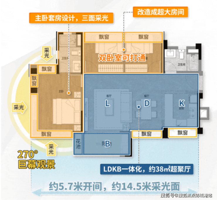 82㎡户型采用南北对流横厅布局,约5.5米N+X无界客餐厅,主卧同样拥有270°转角飘窗和大衣帽间,保证采光通风及视野舒适度。63㎡户型采用LDKB一体化设计,客厅与主卧空间可灵活改造,适合年轻家庭或首置族。整体户型动静分区明确,采光充足,阳台设计充分保证室内外景观互通,让每户都能享受海景与园林景观的完美融合。