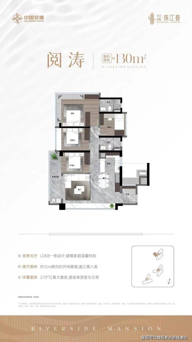 中交四航珠江春首推6-8栋,均靠近珠江,距离珠江约300米。在售面积涵盖130㎡、143㎡以及180㎡三种户型,全部为全南向纯改善四房设计,梯户比为3梯3户或3梯4户,总层高分别为43/45层。具体价格需根据市场情况确定。