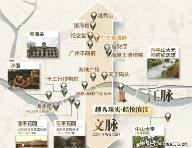 项目位于海珠区东部滨江核心地带,地处新港东路与滨江西路交汇板块,毗邻珠江后航道,区域内自然资源与人文氛围并存,是目前广州主城区少有的具备江景+文脉双重资源的地段之一。该板块历史上是中新侨文化聚集区,近年则因中大搬迁、周边旧改推进等事件迅速升温。