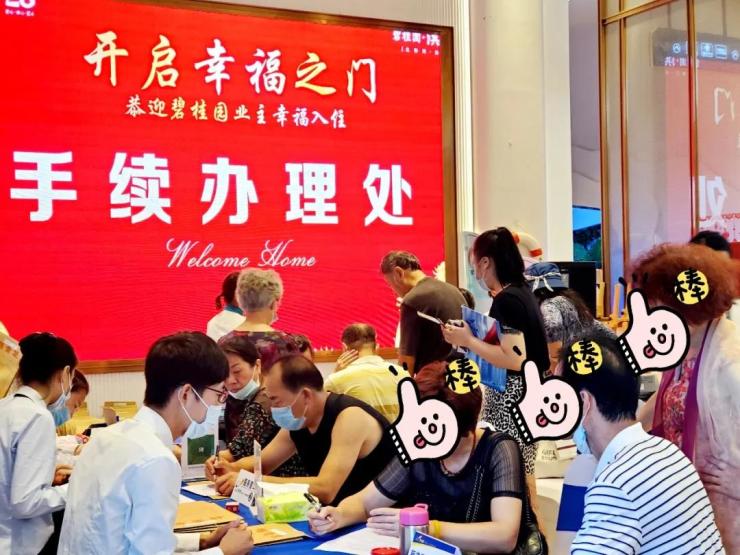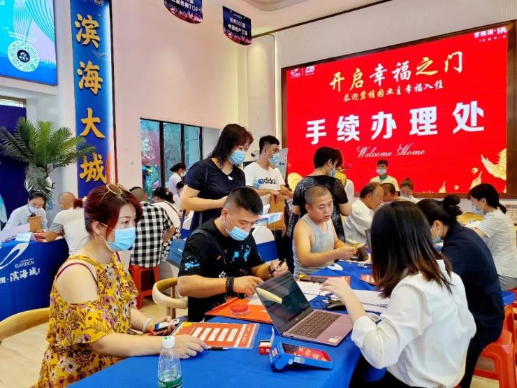 交房处一片忙碌的景象,现场早已挤满了前来办理入住手续的新业主。碧桂园·滨海城苑区的工作人员都怀揣着热忱与感恩之心,迎接着业主们的到来。
