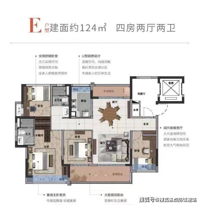 106㎡户型:高配版四房设计,满足家庭成员较多的家庭居住需求。南北对流双阳台,进一步提升通风和采光效果,使室内更加明亮通透。客厅空间开阔,与餐厅相连,形成大气的公共活动区域,适合家庭聚会和休闲娱乐。四个卧室布局合理,动静分区,互不干扰。主卧套房配备独立卫生间和衣帽间,为主人提供舒适私密的休息空间。次卧和其他房间可根据家庭成员的年龄和需求进行灵活布置,如儿童房、老人房或客房。与市场竞品 115㎡同等四房户型相比,该户型空间更大,总价 132 万起,首付 10 万,月供 5100,性价比优势明显。