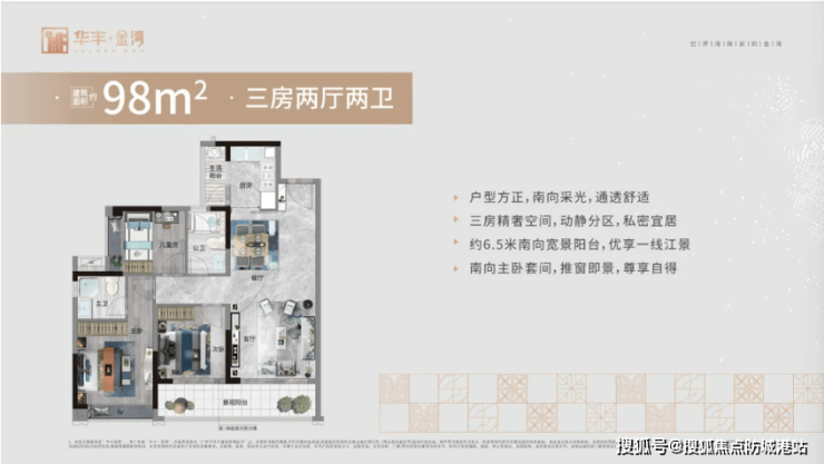 98㎡三房两厅两卫,全南向三开间布局,6.5 米南向景观阳台,小户型同样直面江景,格局方正紧凑,动静分区合理,刚需上车也能享受江景改善品质,空间无冗余浪费,适配年轻家庭、刚需改善置业。