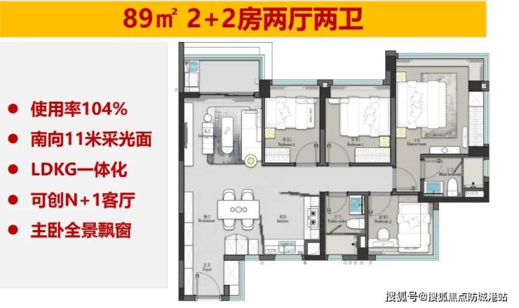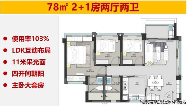 从户型布局来看,项目楼栋均采用了蝶形设计,使得每一户都是单边位,实现了南北通透的效果。尤其是主套,不论是建面约78㎡的北向单位,还是建面约89㎡的南向单位,都做到了朝南,保证了主套的采光通风效果。值得一提的是,市面上大部分78㎡南北对流主套,都需要穿过卫浴,虽然实现了通风,但难免会有异味。而雍云邸的做法,则是利用主卧的飘窗与飘窗实现对流,巧妙避开了卫生间,舒适性更强。