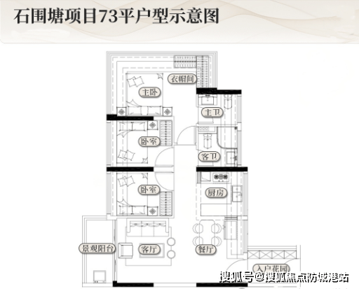 约73平三房户型,规划为3房1.5卫,两个格局相似,核心亮点在于超高使用率和人性化设计。虽然是小户型,但1.5卫的设计几乎能满足正常2卫的使用需求,避免家人洗漱排队的烦恼;主卧采用270°景观视野设计,能最大化享受窗外景观,硬是给小户型做出了以往90多方才有的舒适感,适合刚需入门人群、单身贵族或小家庭居住。