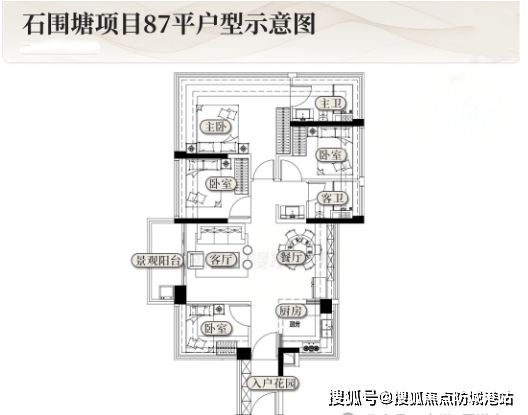 87平四房的第二种格局位于梯腿单边位,做到真正的南北对流,搭配约3.7米大阳台,通风采光效果出众;主卧和主卫均采用双面屏视野设计,创新感十足,既能享受江景或社区景观,又能保证室内的通透性,适合对居住舒适度有较高要求的刚改家庭。