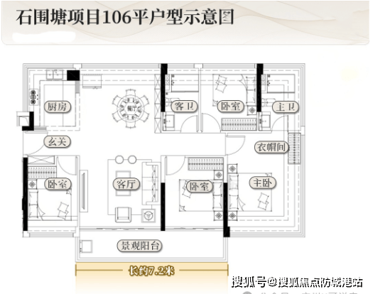 约106平四房户型,全部为单边位设计,可看作是87平边户的“升级版”,适合改善型家庭居住。该户型与87平边户格局相近,但空间更加阔绰;阳台加长至约7.2米,连通次卧,采光通风更佳,同时能打造更多休闲空间;入户区域从书房升级为标准次卧,增加居住空间;主卧更加阔绰,配备独立卫浴和景观飘窗,提升居住舒适度和私密性。