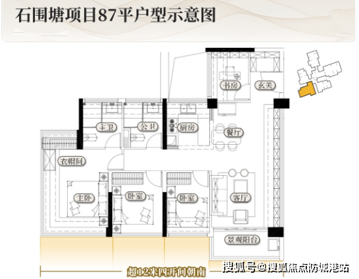约87平四房户型,是项目的核心爆款户型,全部做到真正可居住的四房,而非入户花园凑数,分为两种格局,适配改善型刚需人群。第一种格局拥有独立入户玄关,提升归家仪式感;客厅一整面墙采光搭配通铺飘窗,采光通风效果极佳;客厅和三个房间全南向,超过12米四开间朝南,阳光充足,居住舒适度拉满。