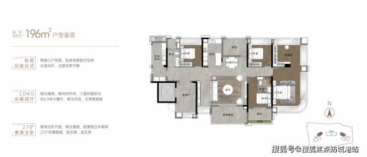 此外,项目户型设计极为考究,全部采用 2T3、2T2 设计,总共仅有 166 户。以建面约 196 平的户型为例,其近 7 米开间奢阔横厅的设计尺度超过了很多 200 平以上的豪宅,搭配 LDKG 一体化设计,餐客厨空间接近 60 平,为住户提供了宽敞舒适的餐饮和娱乐空间。