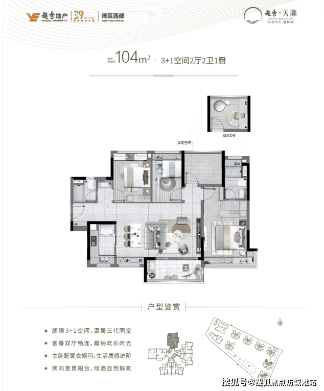104㎡四房两卫:横厅双阳台,全景飘窗无遮挡,江景视野超270°。