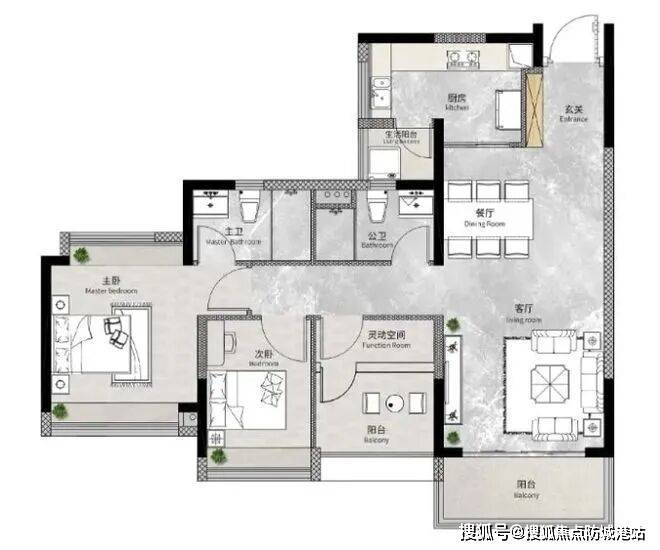 :超宽景观阳台搭配生活阳台,南北对流,功能互不干扰,既保证室内良好通风,又能享受观景与生活便利。