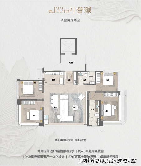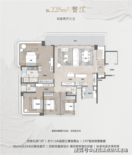主力户型从133㎡到228㎡,全部采用T3梯户比+私梯入户,隐私性和归家仪式感都在线。以133㎡四房为例,纯南向单边户,6.8米观景台连通LDKB一体化方厅,厨房、餐厅、客厅、阳台形成洄游动线,小家庭三代同住也不显局促;而228㎡的大平层直接配了11.5米江幕观景台和双主卧套房,67㎡的云峯会客厅足够容纳一场小型家宴。所有户型按广州新规设计,使用率接近100%,没有浪费一寸空间。