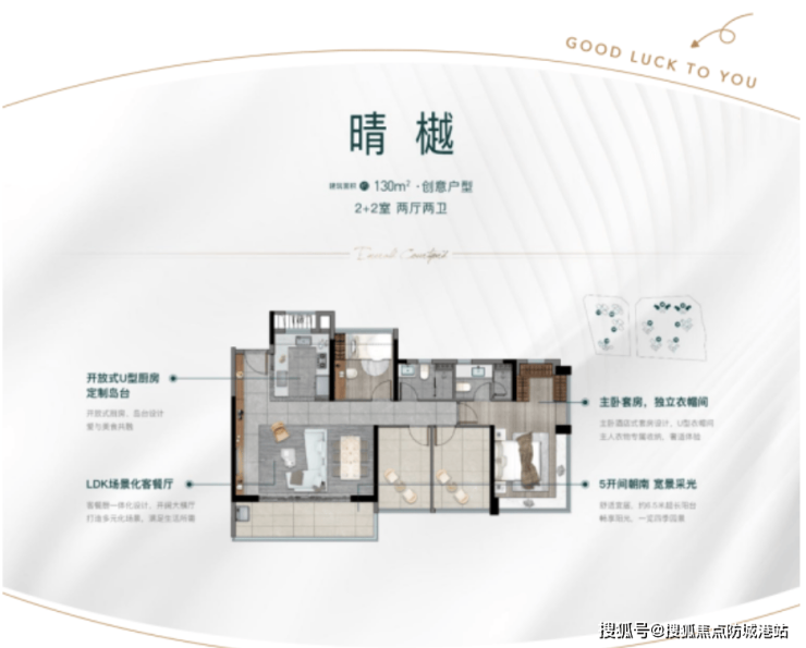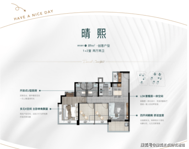 涵盖约89㎡两房、105㎡三房、120㎡三房及130㎡四房,户型设计合理,南向宽景阳台及270°转角飘窗,部分户型带入户花园与衣帽间,功能分区科学。