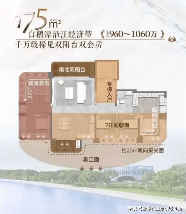 建面455㎡/585㎡超大户型:13层小高层,一层一户,270°一线江景,局部空间可自由定制,满足塔尖人士终极居住梦想。