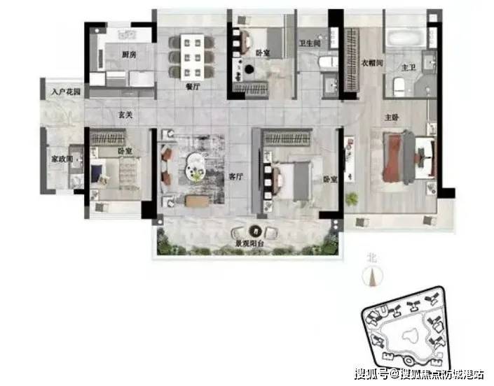 家政间+2次卧+客厅+主卧五开间采光,景观面也更广。餐厅带飘窗、客厅连约7.2米大阳台,是对流条件较好的配置。