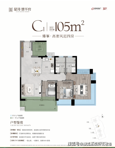 星河臻华府户型设计遵循新规,实用率接近100%,所有住宅户型均朝南,实现光照充足与舒适通风。首开楼栋包括1号楼及9号楼,2梯5户布局为主,户型面积从85平方米三房至125平方米四房不等。
