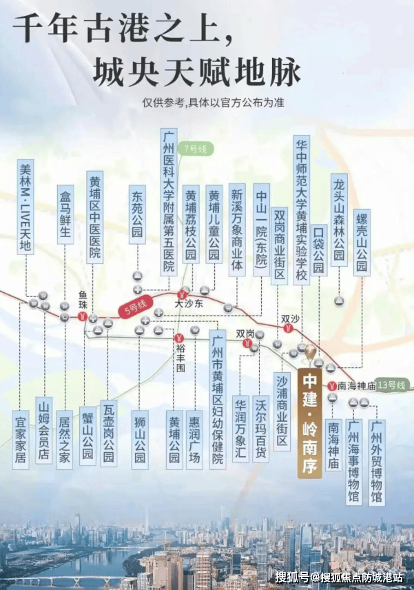 便捷的交通是城市生活的命脉。中建·岭南序地处地铁5号线与13号线交汇辐射圈,步行约800米即达13号线南海神庙站(一期已通车,二期即将贯通)。乘坐5号线无需换乘,可直达珠江新城、金融城;通过13号线则快速连接鱼珠、科学城、万博等重点功能区。