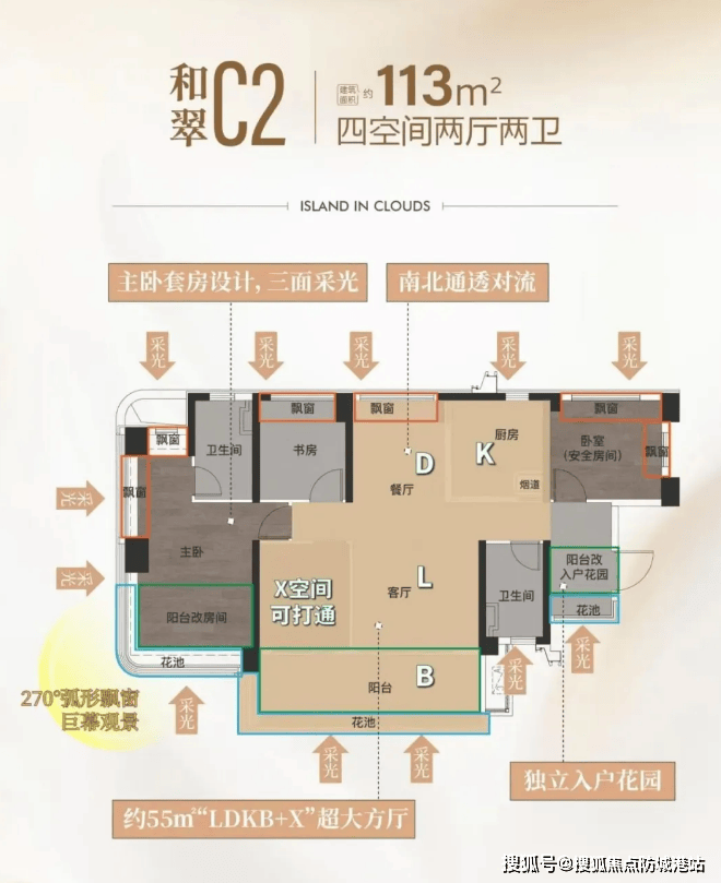 户型三:113㎡四房两卫(改善优选):该户型定位改善,得房率约105%,实际使用面积约118.65㎡,户型方正,南北通透,空间宽敞,适合四口之家或五口之家居住。客厅面宽约4.2米,搭配大阳台,视野开阔,可欣赏社区景观与城市风光;主卧朝南,配备独立卫生间、衣帽间与飘窗,舒适度极高;三个次卧面积均衡,可作为儿童房、老人房或书房,功能齐全;厨房采用U型设计,操作空间充足,同时配备生活阳台,方便储物与清洁。