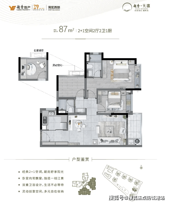 87㎡2+1 房两厅两卫:使用率 94%,南向三开间,直揽江园双景,灵活空间可改书房,适配首次置业;