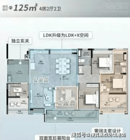 进阶改善客户可关注125㎡四房,四开间朝南,6米大阳台横跨客厅与次卧,主卧配置独立衣帽间及干湿分离卫浴,动静分区明确,私密性与舒适度兼备。
