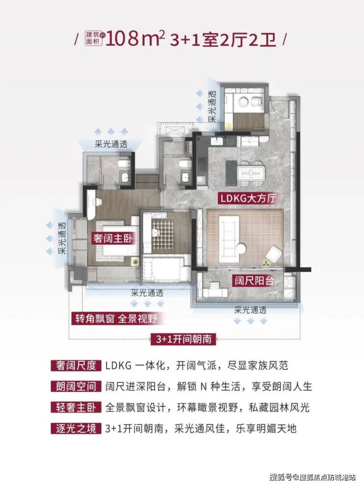 * **【艺术与功能】**:采用半围合式布局,园林最大化,楼间距最大约130米。约138㎡户型双主套设计,南北对流双阳台,客餐厅约5.7米开间,LDKG一体化设计,约53㎡大方厅;约108㎡户型全屋打造“大方厅+交流式客餐厨+270°视野主卧套房”创新格局,方厅面宽约5.6米,约48㎡一体化无界厅。