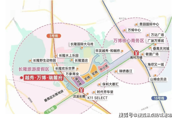 越秀·万博·瑞麓府坐落于番禺区核心地段,紧邻长隆野生动物世界的西南侧,西侧靠近钟顺路。这一地理位置赋予了项目独特的双重属性:一方面,它享受着长隆旅游度假区带来的顶级文旅资源;另一方面,它又处于万博商务区辐射圈的核心地带。随着广州城市发展的不断南拓,万博片区已经从一个普通的商业聚集区,跃升为广州南部最重要的中央商务区之一。去年,万博片区正式进行了扩容升级,规划面积由原来的1.5平方公里大幅扩展至7.2平方公里,规模几乎扩大了五倍,甚至超越了珠江新城6.19平方公里的体量。这一扩容标志着“长隆万博CBD”概念的正式形成,确立了“北天河、南番禺”的双中心格局,使得该区域成为广州新的城市增长极。