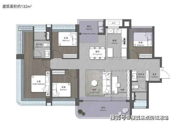 132㎡创意四房两卫:西南向布局,超50平方米大方厅,格局大气开阔。