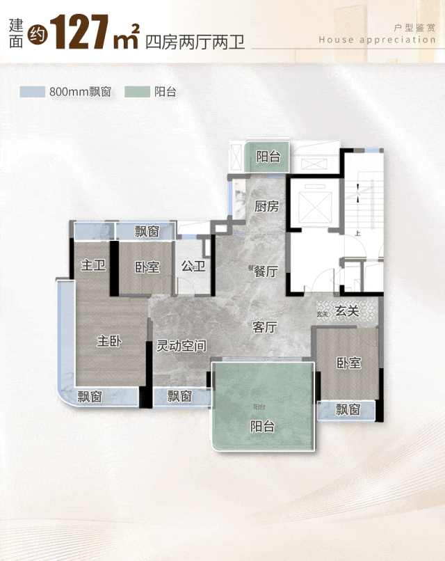 127㎡四房两厅两卫(二期主力刚需改善户型):该户型为二期主力户型,定位刚需改善,建筑面积127㎡,得房率约85%,实际使用面积约108㎡,空间开阔,布局合理。