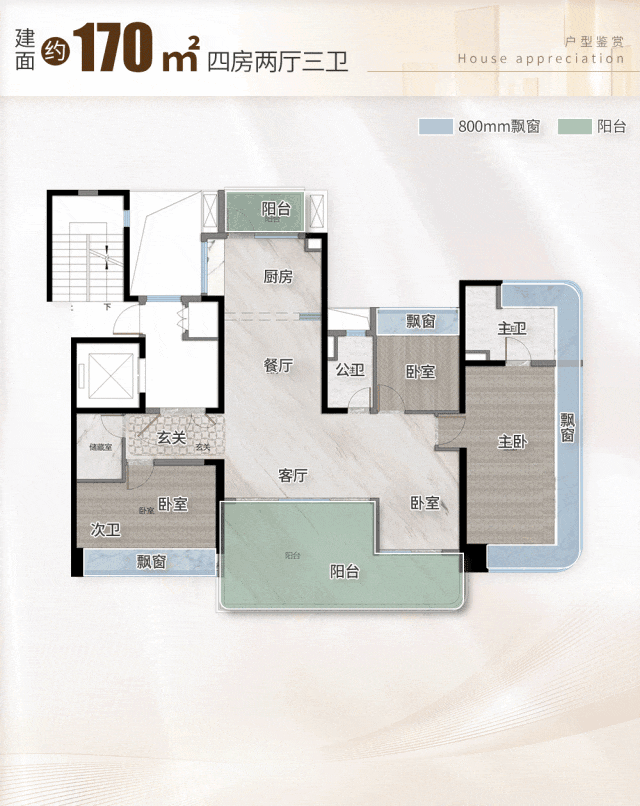 170㎡四房两厅三卫(二期终极改善户型):该户型为二期终极改善王牌产品,建筑面积170㎡,得房率约86%,实际使用面积约146㎡,定位高端改善,适合多人口家庭或追求极致居住体验的购房者。