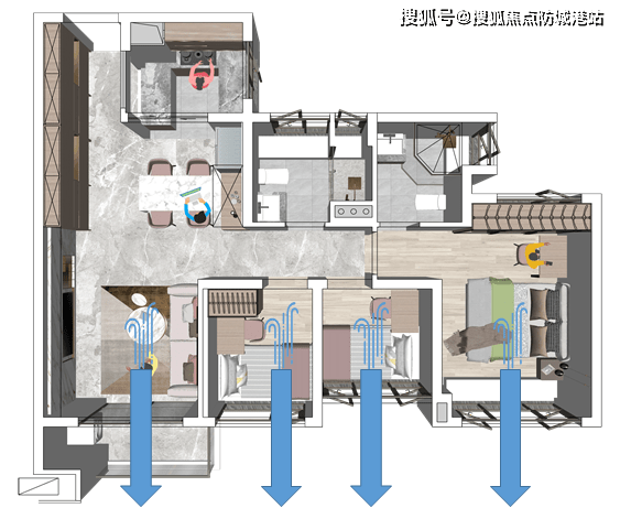 107㎡四房户型,虽然是3+1房,但看起来并不觉得紧凑。而且南北对流,动静分明,空间舒适。