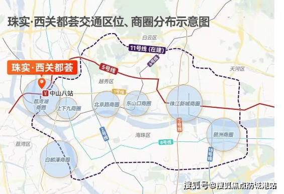 珠实西关都荟地理位置优越,与全市重点项目中山八站 TOD 直线距离仅约 500 米,该 TOD 汇聚 5 号线、11 号线两条广州交通主动脉,还有 34 条公交线路、社会停车场等配套。5 号线作为东西交通大动脉,串联起西关、淘金、珠江新城、金融城等经济核心区域;11 号线已开通,是广州首条环线,串联越秀、荔湾、天河等五区,可直达白鹅潭、琶洲、江南西等繁华片区。自驾方面,通过内环 A、B 线,能无缝衔接中山路、东风路等城市主干道,不堵车时,20 - 40 分钟可通达白鹅潭、广船、珠江新城等重点板块,交通通达性极佳。