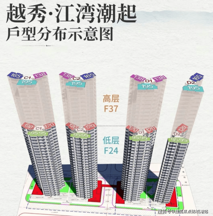 高区为25-37层,两梯三户,有建面约135、160、195平三种户型。