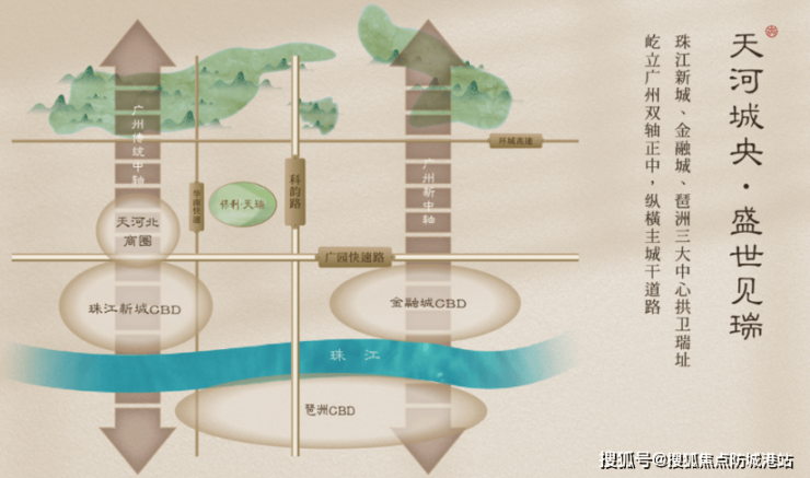 地理位置优越:位于广州传统中轴与新中轴之间的保利天瑞,连接了琶洲与金融城CBD两大发展极点,未来发展潜力巨大。