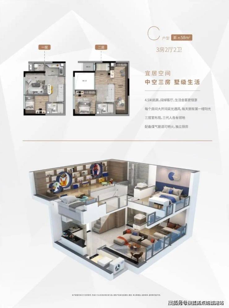 :LOFT一房一厅,4.5米层高,可实现一层办公一层居住,适合创业人士或年轻白领。