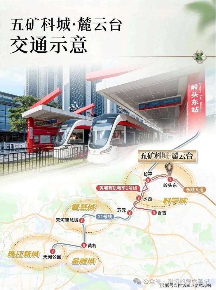 项目紧邻黄埔有轨电车 1 号线岭头东站,步行距离短,可直达黄埔区府板块。通过有轨电车 5 站抵达长平站,换乘地铁 21 号线,快速通往天河区域。自驾方面,项目临近永顺大道,可直达黄埔科学城;经广汕公路可通往天河智慧城,衔接城市核心区域。周边路网完善,可快速接驳环城高速、华南快速等主要道路,形成半小时主城生活圈。公共交通与自驾出行结合,满足业主日常通勤与出行需求。