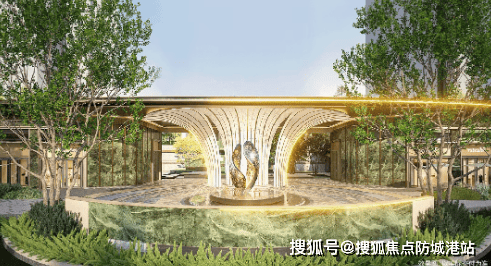 社区主入口打造高约 7.8 米、宽近 50 米的行政级大门,采用香槟金铝板材质,结合岭南榕树意象设计,呈现庄重典雅的视觉效果。入口区域以榕树灵感雕塑为核心,搭配水景雕塑与名贵石材,构建年轮广场与酒店式环岛落客区。社区设置四重归家礼序,从入口广场到庭院空间,再到单元大堂与入户玄关,层层递进,提升居住仪式感与私密性。入口景观与建筑风格统一,兼顾美观性与实用性,为业主提供舒适的出入体验。