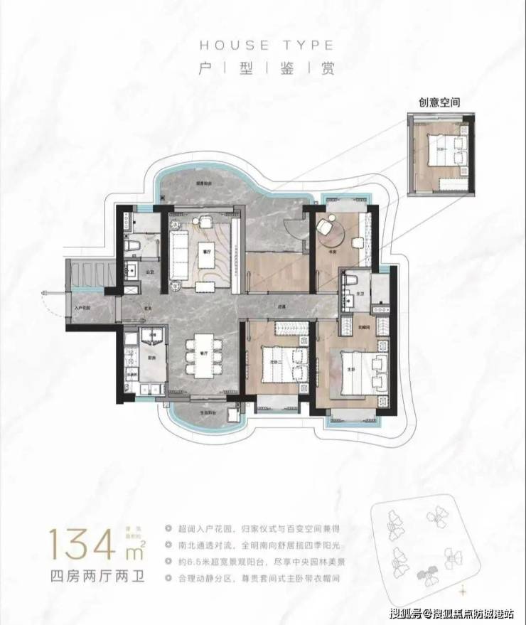 139㎡四室户型:南向大面宽布局,双阳台设计连接景观飘窗,主卧配备独立卫浴及观景窗,得房率83%(市测绘中心报告编号GZ2025CH001),空间利用率行业领先;